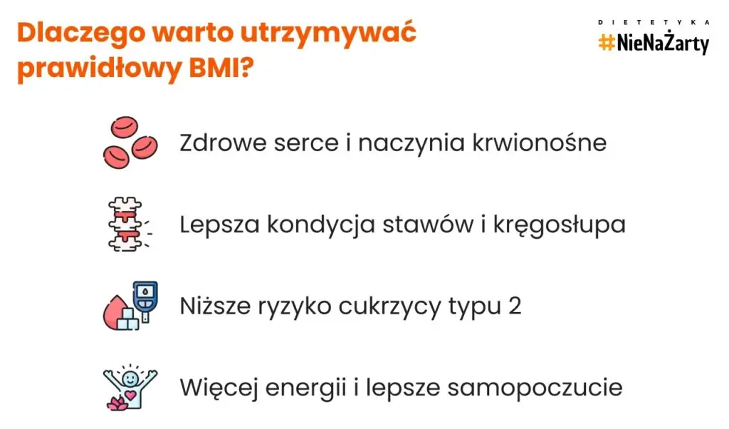 - Mimo że BMI nie rozróżnia masy mięśniowej od tkanki tłuszczowej, jego wartość prognostyczna została potwierdzona w licznych metaanalizach – im wyższy wynik, tym większe ryzyko przedwczesnej śmierci i poważnych chorób przewlekłych.