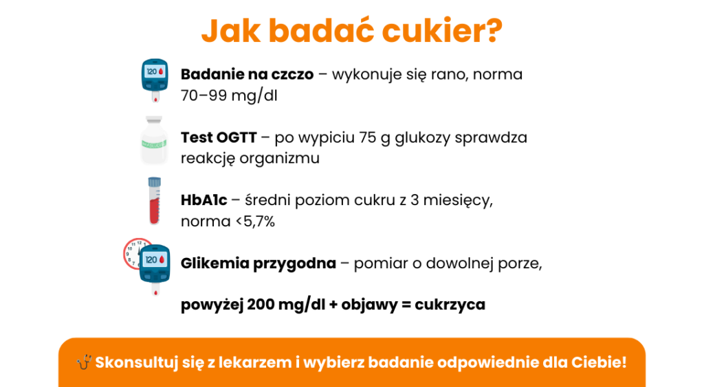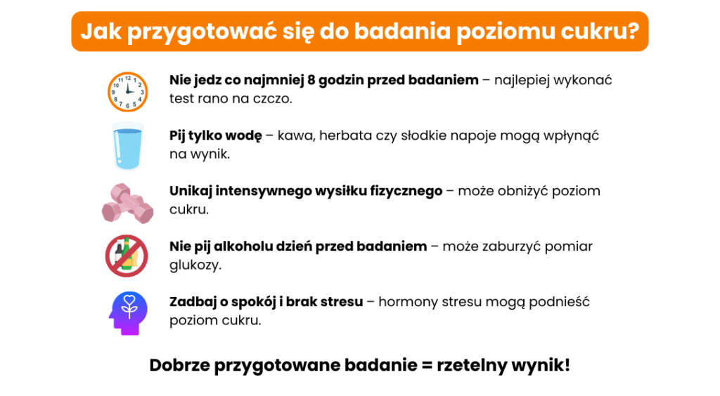 - Przed badaniem cukru należy unikać jedzenia przez co najmniej 8 godzin, nie pić alkoholu i unikać stresu.