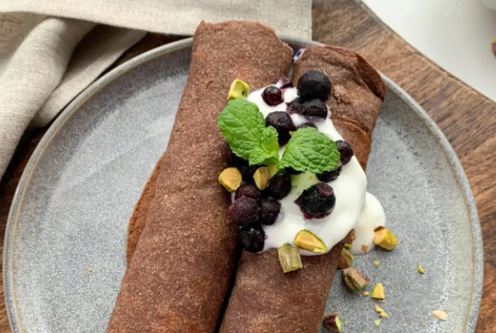 Wysokobiałkowe kakaowe naleśniki z jagodowym twarożkiem świetnie sprawdzą się na kolację dla cukrzyka.
