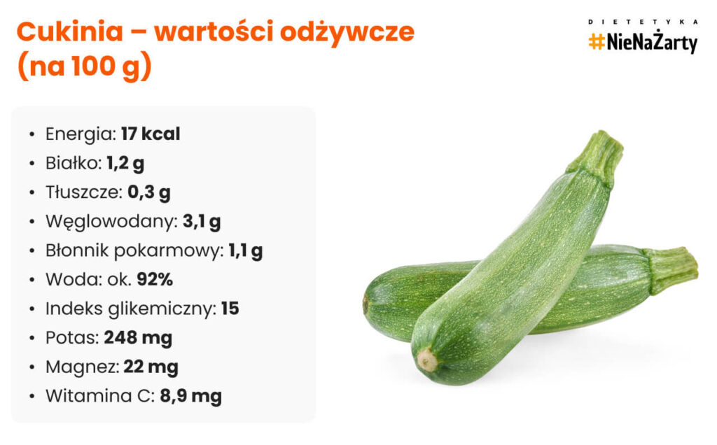 Cukinia jest warzywem praktycznie pozbawionym tłuszczu, zawiera niewielką ilość białka i umiarkowaną ilość węglowodanów. Jej największym atutem jest jednak wysoka zawartość wody oraz obecność błonnika, który korzystnie wpływa na trawienie.