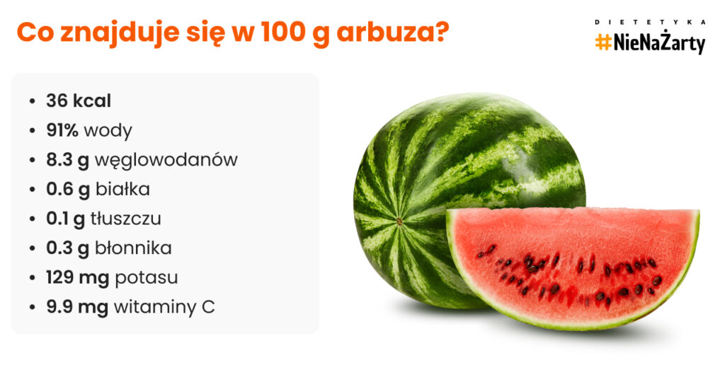 Arbuz to przede wszystkim woda – ponad 90% jego masy to płyn. W 100 gramach znajduje się zaledwie 36 kcal, bardzo mało białka (0,6 g), tłuszczu (0,1 g) i błonnika (0,3 g). Zawiera pewne ilości witaminy C, potasu oraz prowitaminy A (beta-karotenu), ale są to wartości raczej symboliczne.