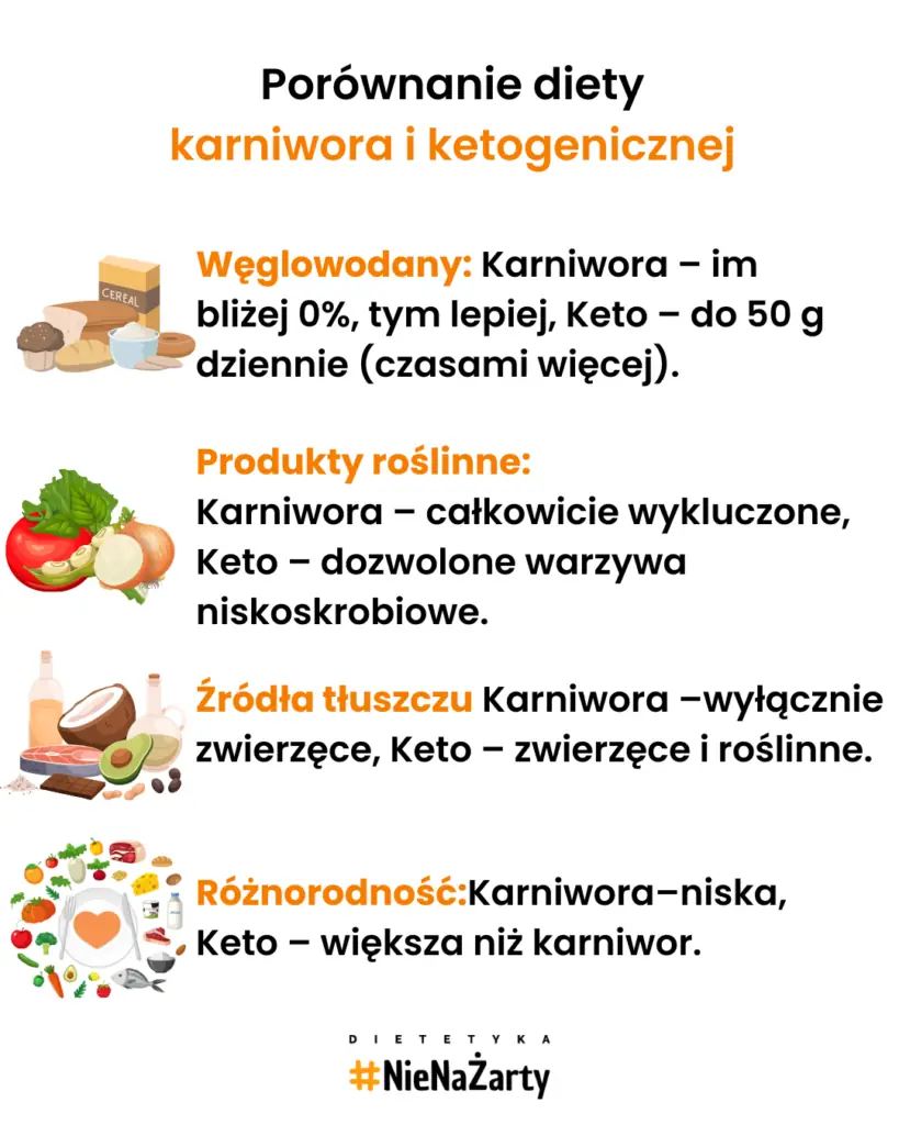 - Porównanie z dietą ketogeniczną wskazuje na bardziej restrykcyjny charakter diety karniwora, wykluczający jakiekolwiek produkty roślinne.