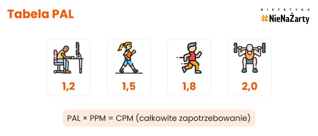 - PAL 1,2 – siedzący tryb życia → PPM × 1,2.
