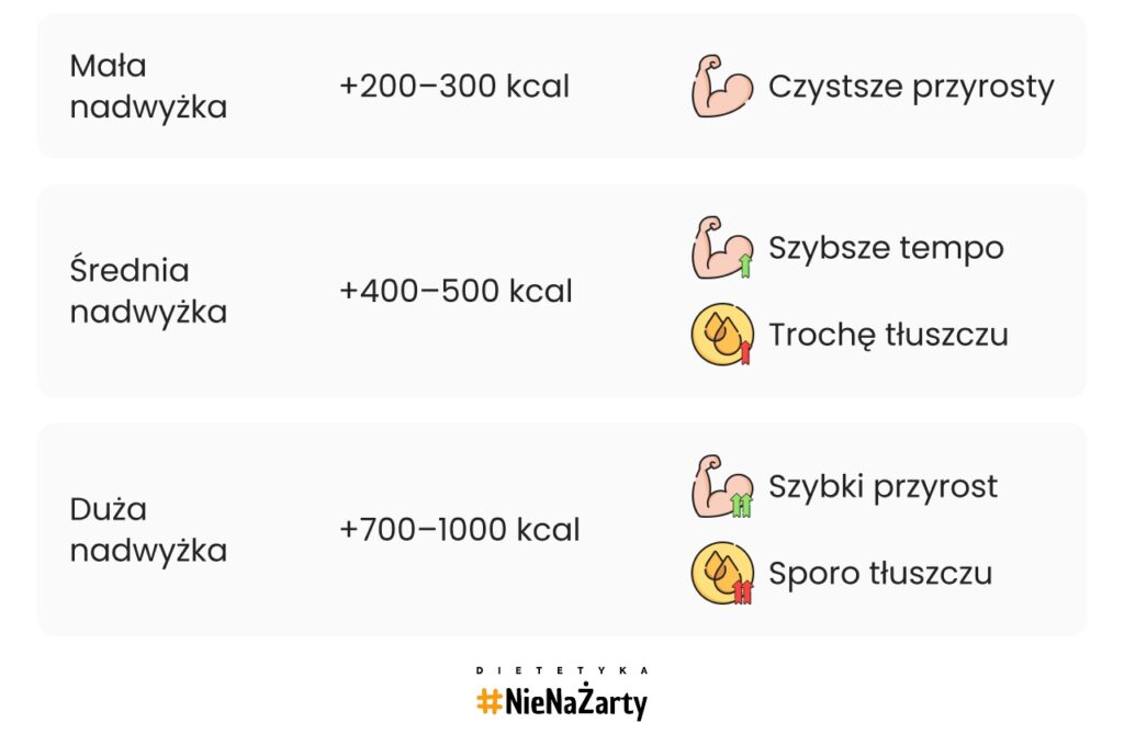 - Średnia nadwyżka: +400–500 kcal dziennie → szybsze tempo tycia, ale większe ryzyko odkładania tłuszczu.