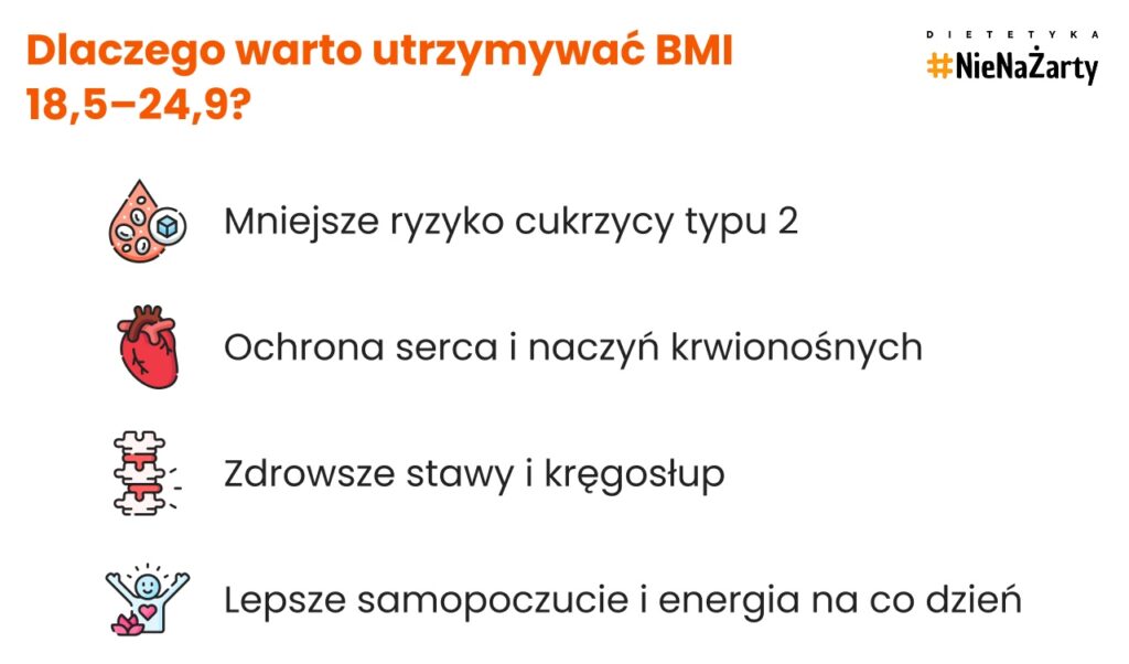 - Utrzymanie BMI w normie to realna korzyść dla zdrowia – lepsze ciśnienie, kondycja serca i stawów, niższe ryzyko chorób cywilizacyjnych.