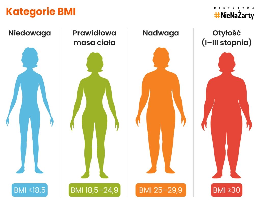 - BMI <18,5 – niedowaga. Niska masa ciała może oznaczać zbyt małą ilość tkanki tłuszczowej i mięśniowej, co zwiększa ryzyko niedożywienia i innych problemów zdrowotnych.