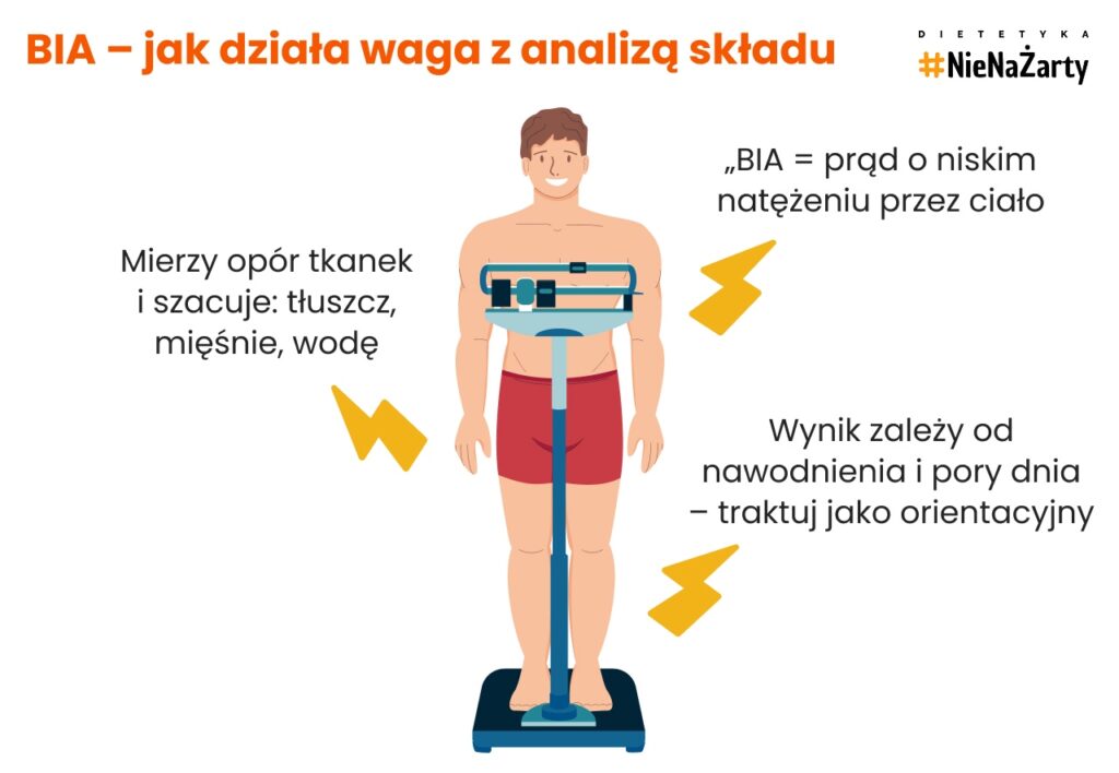 - BIA (bioimpedancja elektryczna) – dostępna w wagach łazienkowych i gabinetach dietetycznych.