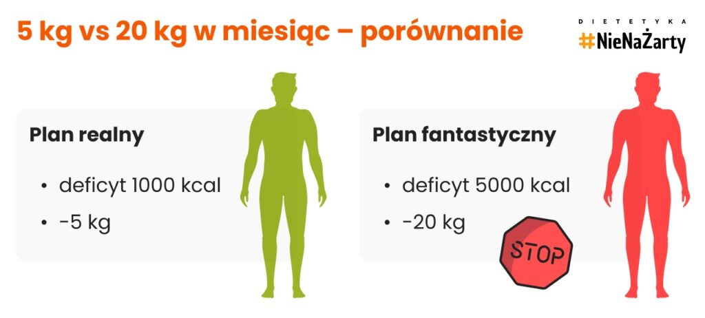 Dzienne „cięcie” kalorii musiałoby wynosić ok. 2600 kcal. Dla wielu osób to więcej niż zużywają w ciągu całego dnia. Wymagałoby to restrykcji graniczącej z głodówką i intensywnego ruchu, co przy nadwadze może skończyć się kontuzjami i przemęczeniem. Utrata masy ciała w takim tempie kończy się zazwyczaj pogorszeniem składu ciała – mniej mięśni, więcej problemów.