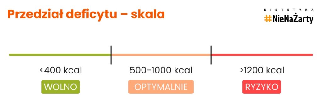 - Nawet przy dużej masie ciała deficyt powinien mieścić się w przedziale 500–1000 kcal dziennie. To zakres, który pozwala spalać tłuszcz bez wyniszczenia organizmu.
