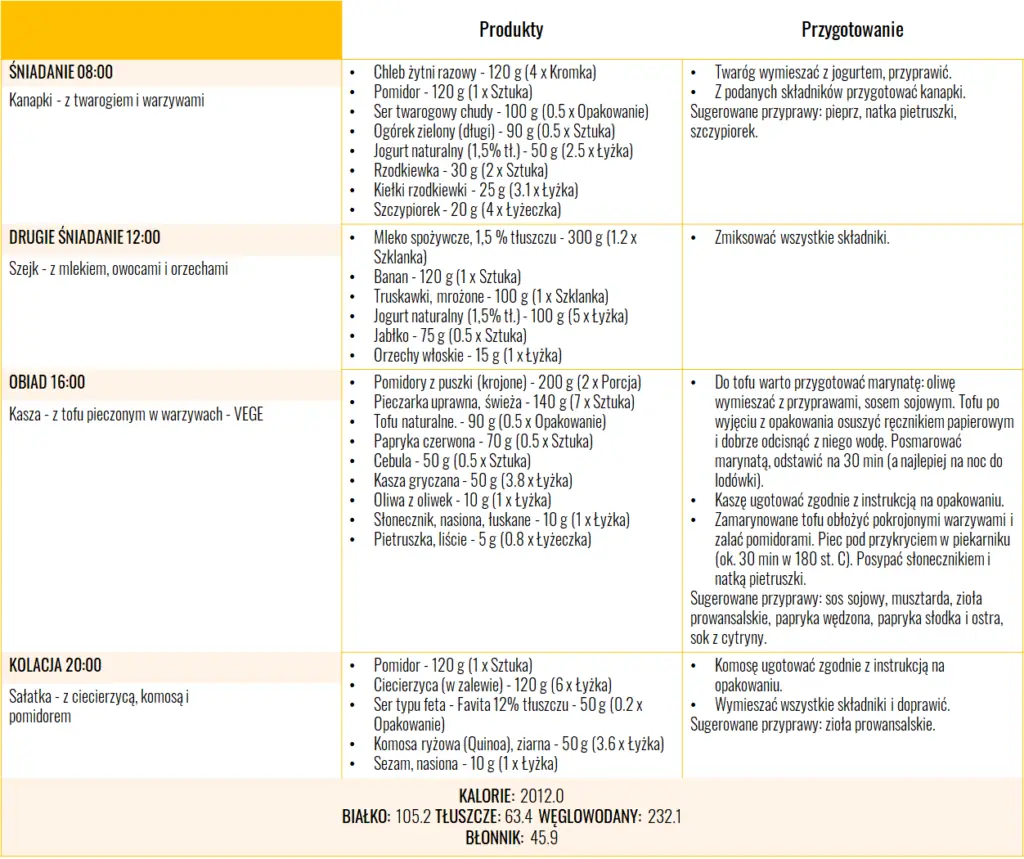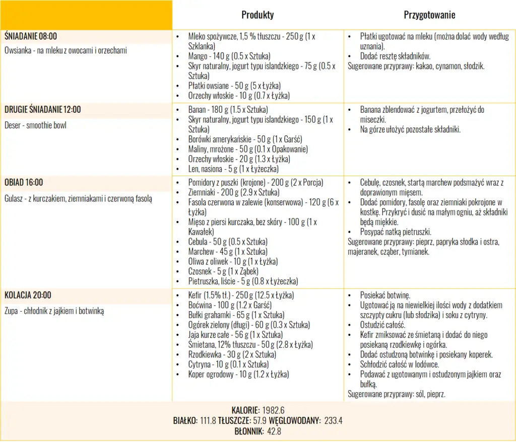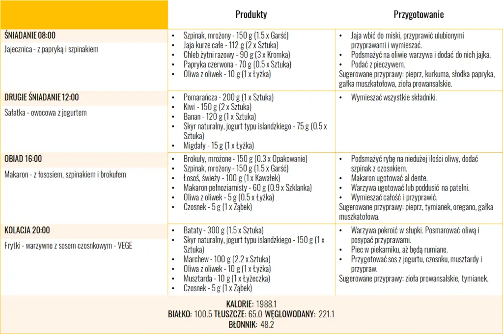 Przygotowaliśmy dla Ciebie przykładowy 3-dniowy jadłospis na schudnięcie z nóg. Jego kaloryczność to ok. 2000 kcal, 105 g białka, 60 g tłuszczy, aż 45 g błonnika oraz 230 g węglowodanów. Co więcej, jest on zgodny z zasadami diety DASH, czyli jednej z najzdrowszych diet na świecie. Odżywiając się w tym stylu, jednocześnie dbasz o swoje zdrowie, a także wspierasz rozbudowę atrakcyjnych ud!
