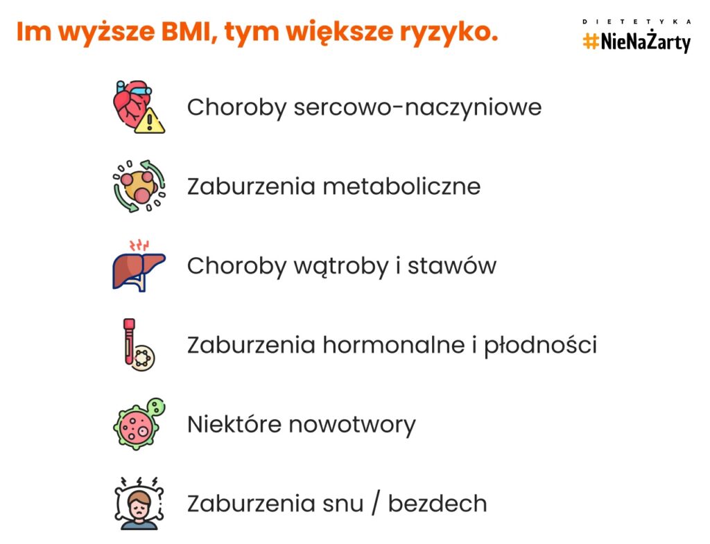 Nadwaga (BMI ≥25) i otyłość (BMI ≥30) to nie „estetyka”. To stan podwyższonego ryzyka. Im wyższy wskaźnik BMI, tym większe ryzyko wystąpienia chorób i krótsza oczekiwana długość życia. BMI ≥40 (otyłość III stopnia) wymaga pilnego działania z udziałem specjalisty.