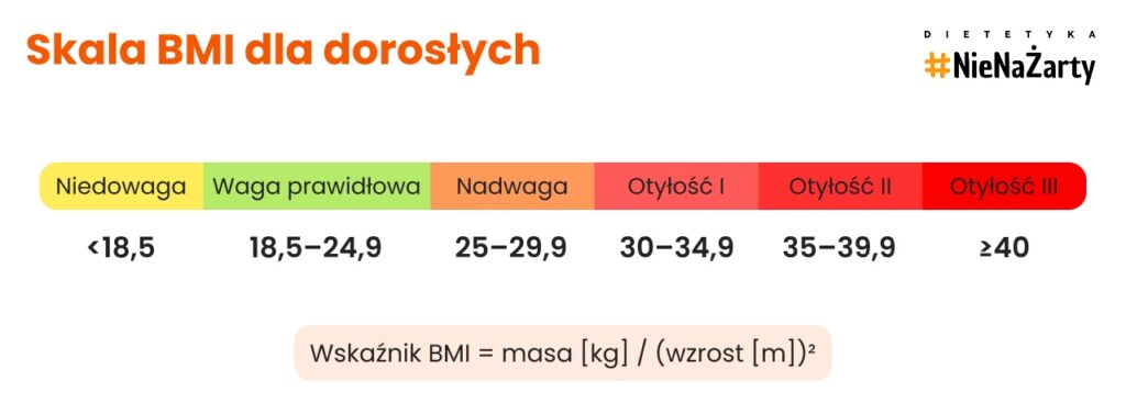 - BMI poniżej 18,5 – niedowaga (masa ciała zbyt niska)