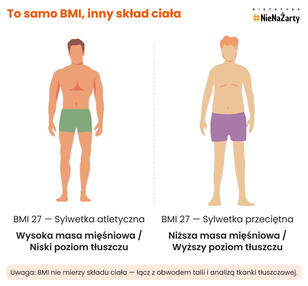 BMI nie uwzględnia składu ciała. U osób bardzo umięśnionych (np. sportowców) wysoka masa mięśniowa może zawyżać wynik i sugerować nadwagę lub otyłość, mimo niskiej zawartości tkanki tłuszczowej [2]. W takich przypadkach lepiej dodatkowo ocenić obwody, poziom tkanki tłuszczowej lub wykonać analizę składu ciała.