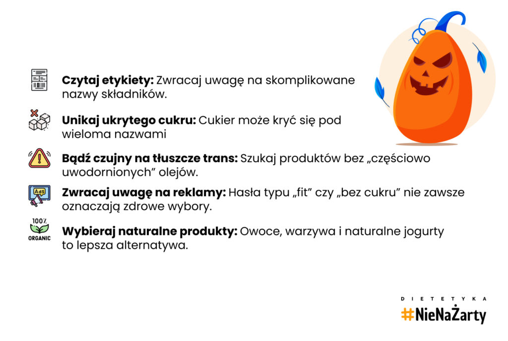 Nie daj się zwieść ich urokowi! Zawsze czytaj etykiety, jakbyś odkrywał mroczne sekrety skrywane w zakamarkach Twojej spiżarni. Pamiętaj, że nie wszystko, co kusi swoją „zdrową” etykietą, jest naprawdę bezpieczne. To pułapki, które mogą zaatakować Twoją sylwetkę i zdrowie w najmniej oczekiwanym momencie!