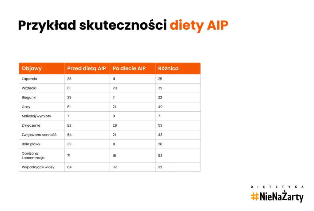 Wyniki to jedna sprawa, a co z objawami? W końcu samopoczucie pacjenta jest najważniejsze. I tak też się stało. Po zastosowaniu diety AIP wiele objawów takich jak zmęczenie, senność, słaba koncentracja czy też sucha skóra zdecydowanie zmalały. Wyniki przedstawione zostały w tabeli poniżej [13]: