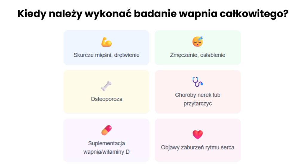 Badanie stężenia wapnia całkowitego warto wykonać w sytuacjach, gdy istnieje ryzyko zaburzeń gospodarki wapniowo-fosforanowej. Do najczęstszych wskazań należą: