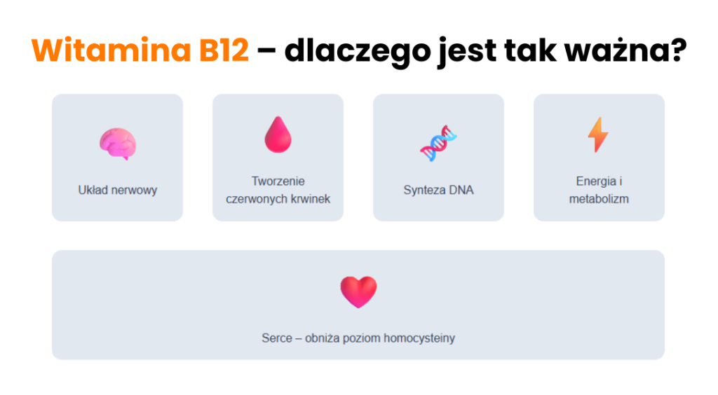 Witamina B12 to kluczowy składnik dla zdrowia układu nerwowego, krwiotwórczego i ogólnej kondycji organizmu. Jej niedobór może prowadzić do poważnych zaburzeń, dlatego warto regularnie kontrolować poziom B12 – zwłaszcza przy diecie roślinnej, chorobach jelit lub niepokojących objawach.