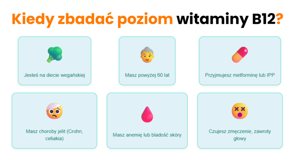 Wskazaniem do oznaczenia stężenia witaminy B12 we krwi jest również podejrzenie zespołu złego wchłaniania oraz kontrola skuteczności suplementacji. Regularna diagnostyka jest szczególnie ważna u osób z grup podwyższonego ryzyka niedoboru.